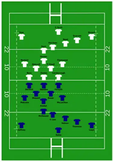 | 13:30 GMT (UTC±00:00) | Report | Try: Bern 3' c Breach 31' m Dow (2) 37' c, 56' m E. Scott (2) 43' m, 49' c Hunter 64' c MacDonald 77' c Con: Scarratt (5/8) 4', 38', 49', 65', 78' Pen: Scarratt (1/1) 19' |