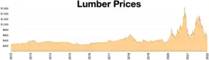 Lumber prices increased with the hot housing market. Potential new American tariffs of 17.99% on Canadian lumber also sent the price higher. Those tariffs were finalized lower to 11.64% by the Biden administration.[17] New contracts that allow semi trucks to haul contracts instead of just rail cars starting August 8, 2022, potentially contributing to normalization of prices in the second half of 2022.[18] Mortgage interest rates rising with inflation is another reason for cooling housing demand and consequently lumber as well.[19]