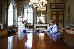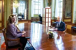 On 18 March, the expected seventeen parliamentary leaders met to discuss the formation, and to select a scout to investigate which coalitions would be possible.[13] In addition to the custom that the largest party to provides the scout, D66 insisted on a second scout from their party. Subsequently, VVD Senate leader Annemarie Jorritsma and D66 Minister of the Interior and Kingdom Relations Kajsa Ollongren were appointed as scouts.[14] On 22 and 23 March the scouts interviewed expected parliamentary leaders on their coalition preferences.[15]