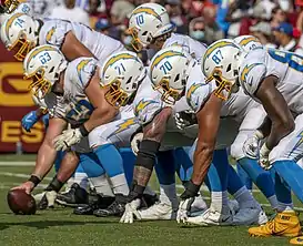 Los Angeles overhauled their offensive line in the offseason after the unit was perceived to have performed poorly in 2020.[9] Starters Dan Feeney, Forrest Lamp, Sam Tevi, and Trai Turner were either waived or allowed to leave in free agency, leaving only Bryan Bulaga to carry over into 2021.[10] The Chargers filled three of their line vacancies through free agency. Center Corey Linsley signed a 5-year contract worth over $60 million.[11] He had spent the previous seven seasons in Green Bay, starting 99 games and being named a 1st-team All-Pro in 2020 by the Associated Press. Former Steelers left guard Matt Feiler signed for three years on the same day,[11] and Oday Aboushi, who had spent the past two seasons at Detroit, was brought in shortly afterward to play right guard.[12]