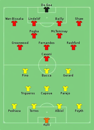 Villarreal opened the scoring in the 29th minute with a goal from Gerard Moreno, diverting the ball into the net with his right leg from six yards out after a free-kick from the left side delivered by Dani Parejo. Edinson Cavani equalized in the 55th minute after a shot by Marcus Rashford from 20 yards deflected off of Scott McTominay to Cavani, who scored with a low shot from five yards out.[25] There were no more goals in normal time or in extra time with the match going to a penalty shoot-out. The first ten penalties from both teams were converted, leaving the goalkeepers to take a penalty. Villarreal keeper Gerónimo Rulli converted his penalty, and then saved David de Gea's attempt to his left, winning his side the trophy.[26]