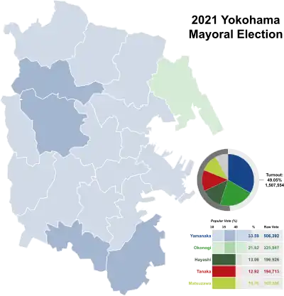 - ↑ "横浜市長選挙候補者別得票数" (PDF). city.yokohama.lg.jp (in Japanese). Retrieved 31 August 2021.