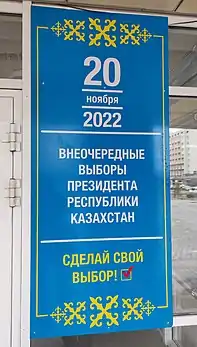 - ↑ Seilkhanov, Adlet (15 November 2022). "Up to 11mln Kazakhstanis can cast their ballots in upcoming presidential elections". Kazinform. Retrieved 20 November 2022.