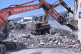 ![]() An excavator clearing building wreckage | |