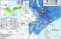 Heavy rain started around 16:00 UTC (6 p.m. local time) on 2 May 2023 and continued throughout the night, killing at least 135 people.[31][6] The Sebeya River burst its banks.[6] The most affected areas in Rwanda were Rutsiro, Nyabihu, Rubavu, and Ngororero.[6] More rainfall is expected during the rest of the month. According to François Habitegeko, the governor of Rwanda's western province, people were crushed by the collapse of several houses, and landslides made the main roads in the area impassable, along with flooded fields.[32][33] 4,100 livestock were killed as well.[5] Landslides and flooding destroyed 26 bridges and 17 roads, 5 health centers, 2 health posts, and a hospital. 5,100 homes were destroyed and an additional 2,500 were damaged.[34] Rwanda's public broadcaster RBA stated that the number of casualties may increase as floodwaters continue to rise.[3]