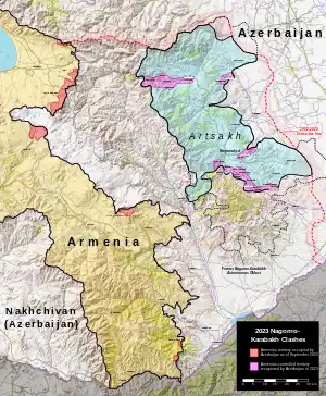 ![]() Military situation in Nagorno-Karabakh on 20 September 2023 Areas captured by Azerbaijan during the offensive