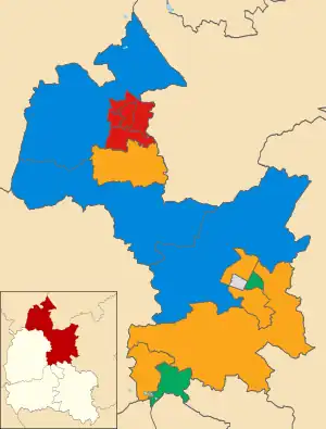 The Conservatives lost control of the council to no overall control.[2] Attempts to form a coalition of the other parties failed to produce an alternative administration. The Conservative leader of the council, Barry Wood, was removed from office at the council's annual meeting on 17 May 2023, but as the council could not agree on a replacement leader the meeting was then adjourned until 23 May 2023. No alternative leader who could command a majority had emerged by then either, and so Barry Wood was reinstated as leader, in charge of a Conservative minority administration.[3]