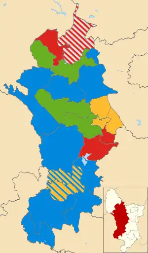 ![]() Map showing the composition of Derbyshire Dales District Council following the election. Striped wards have mixed representation. | ||||||||||||||||||||||||||||||||||||||||||||||||||||||||||||||||||||