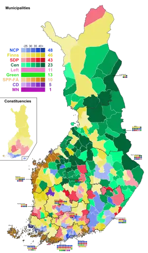 The National Coalition Party won the election with 20.8% of the national popular vote and winning 48 seats in parliament, the third-highest result in the party's history. The party went on to form a coalition with the Finns, Swedish People's Party, and the Christian Democrats, with Petteri Orpo as prime minister. For the first time in Finland's history, the Centre Party did not win a plurality of votes in any regional voting districts.[1] Five government parties and four opposition parties finished with parliamentary seats split at 100–100. This was the first time since 1983 that the top-three finishing parties by results did not lose share of votes by percentage points.