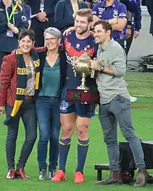 • 29 July – Justin Rodski is forced to defend the club after the Sydney media took offence at the club celebrating the 2007 and 2009 grand final winning teams, displaying the replica Provan-Summons Trophies owned by the Storm.[52] The club displayed the six trophies won by the club before the round 22 match against Parramatta and again at Melbourne's 25th anniversary celebrations, a function attended by over 70 former players. Club legends Billy Slater and Cameron Smith also defending the celebrations,[53][18] with the largest outrage seeming to come from journalists employed by former club owners News Corporation Australia.