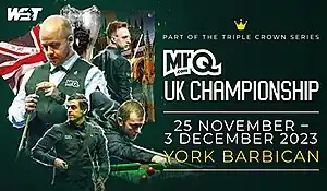 The 2023 UK Championship was a professional snooker tournament that took place from 25 November to 3 December at the York Barbican in York, England.[1] The eighth ranking event and first Triple Crown tournament of the 2023–24 snooker season,[2][3] the tournament was the 47th edition of the UK Championship, which was first held in 1977 as the United Kingdom Professional Snooker Championship. For the tournament's first seven years, only United Kingdom residents or passport holders were eligible to compete.[4][5] At the 1984 event, the UK Championship became a ranking tournament open to players of any nationality.[6][7]