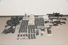 Barakat was wearing a tactical vest carrying several magazines and used a .223-caliber rifle equipped with a binary trigger and double-stacked high-capacity magazines, which were capable of holding up to 60 rounds, in the attack. He also had two handguns on his person, one of which he withdrew but did not fire in the attack.[2] A search of Barakat's vehicle, which he had spray-painted the back windows of,[1] after the shooting discovered seven additional guns, 1,800 rounds of ammunition, a homemade grenade, three gasoline containers, and two propane tanks filled with a homemade explosive compound similar to Tannerite.[7][10][11]