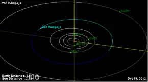 Pompeja (minor planet designation: 203 Pompeja) is a quite large main-belt asteroid. It was discovered by C. H. F. Peters on September 25, 1879, in Clinton, New York, and named after Pompeii, the Roman town destroyed in volcanic eruption in AD 79. This asteroid is orbiting the Sun at a distance of 2.74 AU with an eccentricity (ovalness) of 0.06 and a period of 4.53 yr. The orbital plane is tilted at an angle of 3.2° to the plane of the ecliptic.[2]
