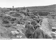In mid-1916, after returning to Egypt the AIF was reorganised and expanded,[4] and the 25th Battalion was returned to the 2nd Division, with which it subsequently served on the Western Front after being transferred to Europe. Its first significant battle there came at Pozières on 28 July 1916 where the battalion suffered heavily during a night-time attack on the heights, losing 12 officers and 350 other ranks killed or wounded, many of whom were caught in thick wire obstacles that had been left intact by the pre-attack artillery bombardment.[5] A follow-up attack on 4 August added more casualties, bringing the total loss for the 25th in its first battle on the Western Front to 785.[1][6] After this, the 25th Battalion spent a brief period around Ypres, where they undertook a series of raids, before returning to the Somme in the last part of 1916 where they undertook further attacks throughout November to extend their observation of the Albert–Bapaume Road.[7]
