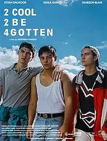 2 Cool 2 Be 4gotten is a 2016 Filipino coming-of-age drama film directed by Petersen Vargas in his feature-length directorial debut and written by Jason Paul Laxamana. The film stars Khalil Ramos, Ethan Salvador and Jameson Blake.[2] It depicts the mysterious coming-of-age tale of Felix after he met half-American Snyder brothers, Magnus and Maxim.