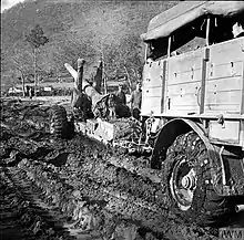 Scammell Pioneer tractor towing a 7.2-inch howitzer of 56th Heavy Regiment round a tight corner in Italy, 23 December 1943.
