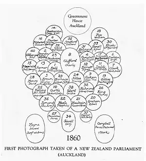 Montage of portraits depicting members of the New Zealand House of Representatives, the Sergeant-at-Arms, and the Clerk of the House, during the Second Parliament in 1860. Government House, Auckland, is at the top. This is the first photo taken of the New Zealand Parliament.