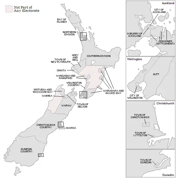 In the South Island, the southern portion of Wairau electorate, plus part of Christchurch Country, became the new Cheviot electorate.[28] The western portion of Dunedin Country was split off and became the new Wallace electorate. The northwest of the South Island remained the colony's only territory not part of an electorate.[28]