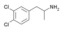 3,4-Dichloroamphetamine (DCA), is an amphetamine derived drug invented by Eli Lilly in the 1960s, which has a number of pharmacological actions. It acts as a highly potent and selective serotonin releasing agent (SSRA) and binds to the serotonin transporter with high affinity,[1][2][3][4] but also acts as a selective serotonergic neurotoxin in a similar manner to the related para-chloroamphetamine, though with slightly lower potency.[5] It is also a monoamine oxidase inhibitor (MAOI),[6] as well as a very potent inhibitor of the enzyme phenylethanolamine N-methyl transferase which normally functions to transform noradrenaline into adrenaline in the body.[7][8]