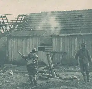 32nd Division was in action again at the Battle of Bazentin Ridge, on 14 July. This time the wire-cutting was more carefully controlled, with FOOs within 200 yards (180 m) of the German trenches to ensure accuracy. The attack went in before dawn, and the intense final bombardment of the enemy line before Zero was cut from 30 minutes to just 5 minutes to ensure surprise. The 18-pdrs and 4.5s firing the barrage used delayed-action fuses to avoid air-bursts in the trees above the troops forming up for the attack. 32nd Division made a subsidiary attack towards Ovillers. The bombardment was accurate and the infantry followed the barrage closely, so the opening of the attack was a great success, but it was not exploited.[14][48][49][50] Afterwards the division was relieved and moved to the Béthune area for the rest of the summer, the guns and mortars positioned round Cambrin and Annequin. Although this was a quieter sector, there were still trench raids and exchanges of mortar and machine gun fire.[32][51][52]