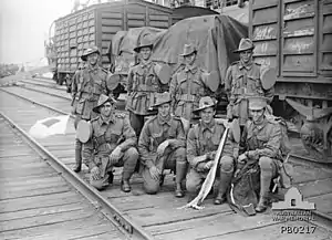 At the outbreak of World War II in September 1939, the 37th Battalion was headquartered around Sale,[25] in Victoria, where it formed part of the 10th Brigade.[26] Due to the provisions of the Defence Act (1903), which precluded sending the Militia outside Australian territory, initially units such as the 37th Battalion were employed to provide training for personnel called up under the compulsory training scheme, which was reactivated in 1940.[27] As a result, throughout 1940–41, as the Militia were called up to undertake periods of continuous training, the 37th Battalion undertook a number of training camps at Seymour. Following Japan's entry into the war in late 1941, they the units of the 3rd Division were mobilised for war service. In August 1942, however, having remained in Australia carrying out garrison duties and having not been deployed on active service overseas, the battalion was again amalgamated with the 52nd Battalion,[19] this time in response to a manpower shortage in the Australian economy that had been brought about by an over mobilisation of Australia's military forces.[28] At this point the battalion became known as the "37th/52nd Battalion" and initially, it was assigned to the 10th Brigade and attached to the 3rd Division, although it was later transferred to the 4th Brigade in September 1942[19] after the 10th Brigade was also disbanded.[29] The 37th/52nd was disbanded after the war on 12 June 1946,[30] having fought against the Japanese in the Huon Peninsula and New Britain campaigns.[19]