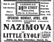 In 1906 the theatrical entrepreneur Lee Shubert had presented Alla Nazimova in matinee performances of three Ibsen plays and was reportedly "bewitched" by the beautiful Russian actress. Hoping to become a major producer of serious drama in New York and to continue promoting Nazimova, he built a new theatre on 39th Street and Broadway which he named Nazimova's 39th Street Theatre. After a two-week delay from the announced date of April 4, 1910, the theatre finally opened on April 18 with Nazimova starring as Rita Allmers in Ibsen's Little Eyolf. While her acting was praised by the critics, the play was not. The New York Times, pronounced it "peculiar" and The Evening Post termed it "dreary, unprofitable, and obnoxious."[2][3]