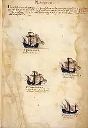 This list of captains is given in João de Barros's Décadas,[2] Damião de Góis's Chronica,[3] Fernão Lopes de Castanheda's História,[4] Diogo do Couto's list,[5] Manuel de Faria e Sousa's Asia [6] and Quintella's Annaes.[7] Fernão Pacheco replaces Barbosa in several lists: Gaspar Correia's Lendas[8] and the Relação das Naus.[9] The Livro de Lisuarte de Abreu replaces Novais and Barbosa with Rui de Abreu and Duarte Pacheco, respectively.[10]