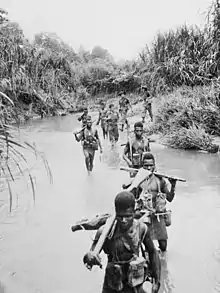 Along with the Papuan Infantry Battalion (PIB), and the 1st, 2nd and 3rd New Guinea Infantry Battalions, 4 NGIB formed part of the Pacific Islands Regiment (PIR), which had originally been formed in November 1944, when the PIB and 1 and 2 NGIB had been amalgamated into the regiment. Another battalion, the 5th New Guinea Infantry Battalion, was also authorised, but was never raised.[6] 4 NGIB was disbanded in October 1945 without having seen active service.[4] In the post war period, the PIR was re-formed in 1951, building on the tradition established during the war. One battalion was formed in New Guinea at this time, and another in Papua.[7]