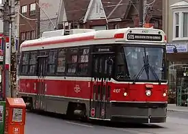 On February 18, 2018, the route began being operated with buses instead of streetcars due to a streetcar shortage[6] and to reassign streetcars in order to address crowding on other routes.[7] Streetcar service was originally expected to return on March 29, 2020, but was delayed to complete upgrades to the overhead infrastructure for pantograph operation.[8][9] On April 20, 2020, Flexity Outlook streetcars went into service on 505 Dundas on the same day that streetcars were withdrawn from 511 Bathurst due to construction projects.[10]
