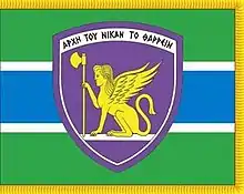 The brigade's emblem features a purple triangular shield upon which is depicted a golden sphinx wielding a poleaxe. A scroll underneath the sphinx bears the unit's abbreviated title. The whole is edged in white, with an inscription above with the unit's motto, Αρχή του νικάν το θαρρείν ("Courage is the foundation of victory"), a quote from Plutarch (Life of Themistocles, 8.2) referring to the Battle of Artemisium in 480 BC.[2]