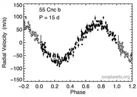 55 Cancri b was discovered in 1996 by Geoffrey Marcy and R. Paul Butler. It was the fourth known extrasolar planet, excluding pulsar planets. It was discovered by detecting variations in its star's radial velocity caused by the planet's gravity. By making sensitive measurements of the Doppler shift of the spectrum of 55 Cancri A, a 15-day periodicity was detected. The planet was announced in 1996, together with the planet of Tau Boötis and the innermost planet of Upsilon Andromedae.[9]