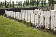Bridge House Cemetery, named after a nearby farmhouse, was made by the 59th (North Midland) Division in September 1917. All but five of the 45 burials are of men of the division, and all but one date from the Battle of Polygon Wood.[5]