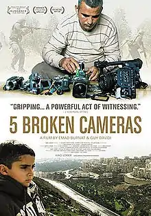 5 Broken Cameras (Arabic: خمس كاميرات محطمة, romanized: Khams Kamīrāt Muḥaṭṭamah; Hebrew: חמש מצלמות שבורות, romanized: Hamesh Matslemot Shvurot) is a 94-minute documentary film co-directed by Palestinian Emad Burnat and Israeli Guy Davidi. It was shown at film festivals in 2011 and placed in general release by Kino Lorber in 2012. 5 Broken Cameras is a first-hand account of protests in Bil'in, a West Bank village affected by the Israeli West Bank barrier. The documentary was shot almost entirely by Palestinian farmer Emad Burnat, who bought his first camera in 2005 to record the birth of his youngest son. In 2009 Israeli co-director Guy Davidi joined the project. Structured around the destruction of Burnat's cameras, the filmmakers' collaboration follows one family's evolution over five years of turmoil.[2] The film won a 2012 Sundance Film Festival award, it won the Golden Apricot at the 2012 Yerevan International Film Festival, Armenia, for Best Documentary Film, won the 2013 International Emmy Award,[3][4] and was nominated for a 2013 Academy Award.