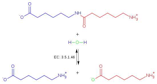 In enzymology, a 6-aminohexanoate-dimer hydrolase (EC 3.5.1.46) is an enzyme that catalyzes the chemical reaction N-(6-aminohexanoyl)-6-aminohexanoate + H2O 2 6-aminohexanoate. Thus, the two substrates of this enzyme are N-(6-aminohexanoyl)-6-aminohexanoate and H2O, whereas its product is two molecules of 6-aminohexanoate.