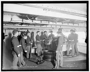 ![]() USS Massachusetts (BB-2), 6-inch/40 caliber gun and crew. | |