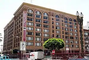The building opened on January 15, 1905 as a terminal for the electric railways being constructed by Henry Huntington.[2] In 1914, a total of 1,626 scheduled Pacific Electric trains entered or left Los Angeles at Main Street Station in 3262 interurban car trips daily.[3] The elevated tracks and passenger concourse on the back of the building were constructed in 1916.[4]