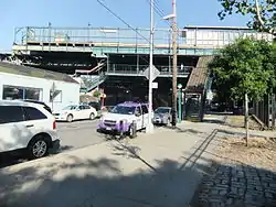 The 71st Street station opened on June 24, 1916 along with the first portion of the BMT West End Line from 36th Street on the BMT Fourth Avenue Line to 18th Avenue station.[3][4] The line was originally a surface excursion railway to Coney Island, called the Brooklyn, Bath and Coney Island Railroad, which was established in 1862, but did not reach Coney Island until 1864.[5] Under the Dual Contracts of 1913, an elevated line was built over New Utrecht Avenue, 86th Street and Stillwell Avenue. The section of the West End Line between 62nd Street and 18th Avenue originally opened with only one track in service. The second track between 62nd Street and 18th Avenue opened on July 8, 1916.[6]