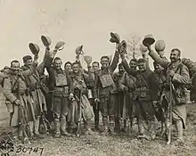 American and French soldiers at the front. The Americans (who during the war were given the nickname of doughboys) are Private John J. Burke, Corporal Victor E. Cowley and Private J. R. Keith, and are all from the 1st Battalion, 312th Infantry Regiment, 78th Division, while the French are from the 320th Regiment. The picture was taken in Boult-aux-Bois, Ardennes, France, sometime in 1918.