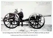 The Swiss gun was mounted on the iron carriage of the 4-pounder breechloader, which was changed to fit the new gun.[10] Later the 8.4 cm Feldgeschütz Ord 1879 would be mounted on the same carriage. Nevertheless, the carriage only applied to the 145 guns serving in the field army.[32]