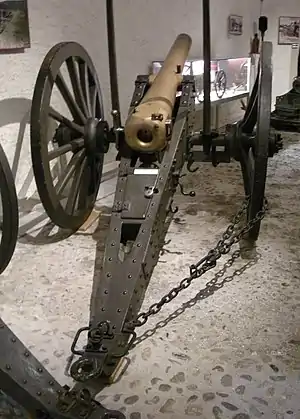 The iron carriage had a steel axle, and wooden wheels with iron tires. There were two brackets of sheet iron which converged to the point where the gun was towed. The gun was fixed with its trunnions fitting into two semi-circular openings in the brackets. These were then locked shut with a semi-circular iron clasp. Between the brackets there was a small trail-box. The elevation screw came up from the carriage to a point below the breech of the gun. The screw was operated by a hand-wheel situated on the outer face of the right bracket.[33] The gun carriage did not allow for sideways movement of the barrel. Taking aim was done by shifting the rear of the carriage. To gain leverage, one of the poles sticking upwards on the side of the barrel (see e.g. the photo of the gun in the Waadtländisches Militärmuseum Morges) was placed in an opening at the end of the carriage.