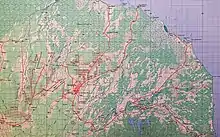 A cornerstone of the high quality scale 1:100,000 topographic line maps produced of the entire country in the 1970s was the geodetic survey on which the topographic survey was based. The high order astronomic/triangulation/trilateration network through the Papua and New Guinea highlands was undertaken by Australia's Division of National Mapping (DNM) 1962–1965.[10] At the same time (1962 and 1963) Topo Sqn AHQ Svy Regt undertook a high order coastal traverse around mainland Papua and New Guinea with intersections to the DNM highlands survey when the beacons were visible.[11] The rapid progress of surveys in the 1960s would not have been possible if it was not for the technological development of the microwave electromagnetic distance measurement man-portable system Tellurometer and using helicopters capable of positioning and resupplying survey parties on high altitude survey stations between 10,000 feet and 15,000 feet above sea level. In 1963 the Australian Government was very concerned about the land border with Indonesia an area very poorly mapped. RA Svy used a new Radar Airborne Profile Recorder to map the border area which required additional horizontal and vertical control such that height contours could be mapped. In 1964, Topo Sqn AHQ Svy Regt undertook a three-year program of topographic survey control for scale 1:100,000 mapping of a three degree longitude band east of the land border. Horizontal control was by trilateration network using a new airborne electromagnetic distance measurement system, Aerodist MRC2, connected to the high order surveys established by RA Svy and DNM 1962 -1965. [12] Mixed results were achieved with mapping photography of the border area in the 1960s. At the same time a US Air Force airborne High Frequency Ranging and Navigation (HIRAN) trilateration network measuring long lines between ground stations connected Australia, Papua, New Guinea, New Britain, New Ireland and Buka (Bougainville) to a wider South West Pacific Survey to the north-east.[13] All of these surveys contributed to the 1966 Australian geodetic network adjustment and the resulting coordinate set in the Australian Geodetic Datum 1966. Australia had decided to map the entire Territory at scale 1:100,000 and control surveys for the remainder of mainland PNG were taken up on operations from four to nine months long by Northern Command Field Survey Unit/1 Fd Svy Sqn (Brisbane) mainly using Aerodist MRC2 in 1969 and 1970, and by 4 Fd Svy Sqn (Adelaide) mainly using Aerodist MRB3/201 (computer assisted) from 1972 to 1974 and portable Transit Doppler satellite (US Navy navigation satellites) AN/PRR-14 Geodetic Receiver (Geoceivers) in 1974. In 1970 a British Royal Engineer Survey Troop was attached to 1 Fd Svy Sqn. Vertical (height) control for the mapping was a combination of trigonometric heighting, barometric heighting by Army Sioux helicopter, levelling with connections to sea level and WREMAPS II Airborne Profile Recorder (APR).[6][9][14][15]