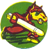 - ↑ Approved 15 May 1942. Description: On an emerald green disc a caricatured horse yellow, outlined in black, trimmed in brown, wearing coveralls, aviator's helmet and goggles of brown, shoes black, trimmed in yellow, with three zigzag speed lines of black issuing from left foot, carrying under his right arm a white aerial bomb outlined in black, shaded in yellow.