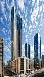 The building is a 79-story, 900 ft (274 m) tall residential skyscraper. The building takes up an entire city block in downtown. It has a porte-cochere entrance, where the lobby is located, as well as the entrance to the parking garage. The building has a limestone and glass facade, echoing to Art Deco Style. The building contains three open plazas, and a residential rooftop garden above an eight-story podium. Along the sidewalk, there are storefronts with large windows between limestone piers. At night, lighting features on the piers light up.[9][10]