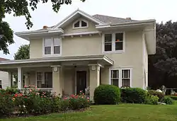 The A.A. Hurst House is a historic residence located in Maquoketa, Iowa, United States. This house shows the strongest influences of the Prairie School style in town.[2] It was built on the site of a previous house at a time when newer and larger houses were replacing Maquoketa's older buildings. It was designed by Davenport architect E.G. Holbrook. The two-story house features a low pitched hip roof, broad eaves, paired windows, banded windows in groups, a stuccoed exterior, and a broad porch. Abe A. Hurst was the son of Alfred Hurst, who founded the A. Hurst and Company Lime Works and the company town of Hurstville. In addition to the family business, they were also involved with Maquoketa Electric Light and Power Company. This connection allowed Abe to be involved with the construction of Lakehurst, a hydro dam and power plant, in 1923. The house was listed on the National Register of Historic Places in 1991.[1]
