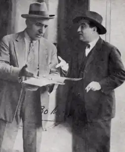 Herz also attempted a return to mainstream theater with the 1925 plays Aripi frânte ("Broken Wings") and Seară pierdută ("Wasted Evening").[3] The former, written in verse, depicted events from the life of Ștefăniță, a 17th-century Moldavian exile in the Holy Roman Empire.[137] Also in 1925, alongside Dragomirescu, Brătescu-Voinești, Rebreanu and V. Al. Jean, Herz was an executive of Filmul Românesc society, dedicated to the promotion and moral review of Romanian cinema productions.[138] Around that time, he became editor-in-chief of Dimineața daily.[53] This allowed him to publish a lavish praise of his own Păianjenul, which was being produced by Aurel Ion Maican at Brăila City Theater.[139] Also that year, Maican directed a new production of Mărgeluș.[140] Moving on from Dimineața, Herz worked as a broadcaster for the newly inaugurated Radio Company, with a series of interviews with actors.[2] Later contributions for Tănase's revues were Din toată inima ("With a Full Heart")[141] and Între ciocan și nicovală ("Between a Rock and a Hard Place"), co-authored with Nicolae Vlădoianu; both were performed by and his troupe in 1928. The Herz–Vlădoianu collaboration used talents such as Alexandru Giugaru and a number by the Romanian version of Mutt and Jeff; its "dizzying rhythm" garnered "sidesplitting laughter".[142] Alongside Vlădoianu and Nicolae Kirițescu, Herz, using the pen name "Puck", also wrote the show Negru pe alb ("Black on White"), made famous for starring an African American dancer, Josephine Baker.[143]