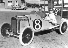 Atkinson mistakenly identified another Singer works entry was that of the Coventry Premier driven by Arthur (which should read Alfred) Dixon. It was a works entry, that would indicate that Dixon was part of the Singer company. Dixon's car wore a number 8 for the race was basically standard even down to its disk wheels. A Goodwin was the mechanic for Dixon. Dixon managed to take his car the full distance, finishing a highly creditable fourth place at an average speed of 55 mph."[6] Austin Harris has two excellent photographs of the race, Dixon's car is number 8.[7]