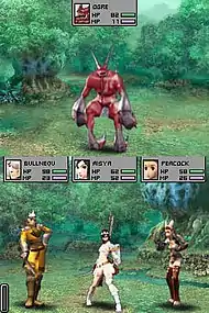 Sakaguchi was attracted to the DS, as it felt like a PDA-style device he used to play games during flights between Hawaii and Japan, and he was fascinated by the idea of creating a world conveyed using two screens.[16][1] This wish led to battle information and action being equally divided between the top and bottom screens rather than one being subordinate to the other.[15] He created an early prototype build which proved to be more successful than he expected.[1] For the gameplay, he wanted to pay homage to early influences on his liking for the genre, including Fire Emblem and Famicom Wars alongside Tactics, but make the gameplay stand out.[15] The gameplay design drew inspiration from the Daisenryaku series.[18] Sakaguchi's wish was to create a hybrid system between tactical RPGs and traditional RPGs.[1] Game balance was an important factor for him, as he wanted the title to be approachable for genre newcomers, leading to some unspecified design changes and a careful incorporation of tutorials to explain its battle system.[15]