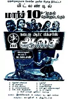 Aasai (transl. Desire) is a 1956 Indian Tamil-language film, produced and directed by M. Natesan. The dialogues were written by Ilangovan, K. V. Gnanasambantham and Ve. Laxmanan and the story was written by M. Natesan. The film stars Gemini Ganesan and Padmini.[1][2][3]