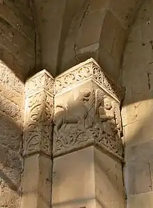 The abbey church has a semicircular apse. In the twelfth century, a portico with two arches and an upper loggia, with capitals depicting the symbols of the evangelists, was added. At the apse are stairs descending to a crypt which putatively held the remains of St Basilide. On the southern side of the church are portions of a still functioning monastery.