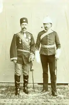 Sir Percy Sykes next to Abdol-Hossein Farmanfarma in Kerman, 1902